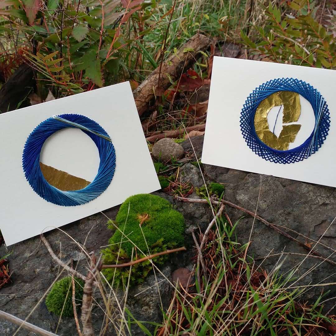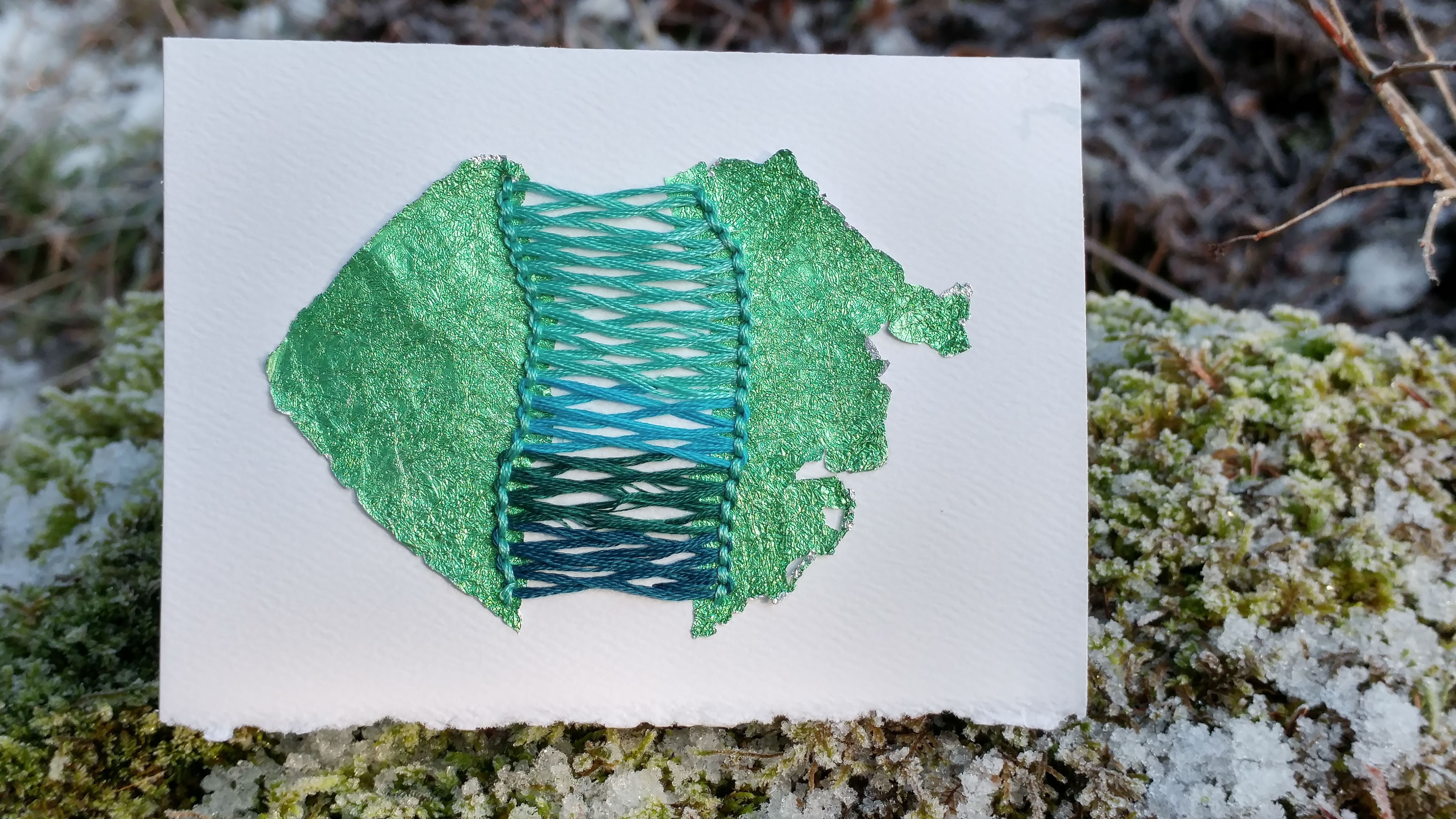 Embroidery on heavy paper, embroidery floss and foil. Designs vary but open to requests. Comes with envelope. 6 7/8 x 5 in.