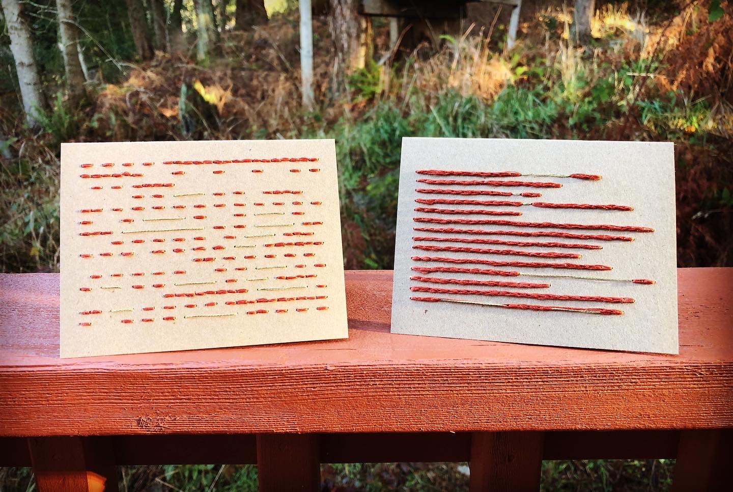 Embroidery on heavy paper, embroidery floss. Designs vary but open to requests. Comes with envelope. 4.25 x 5.5 in.