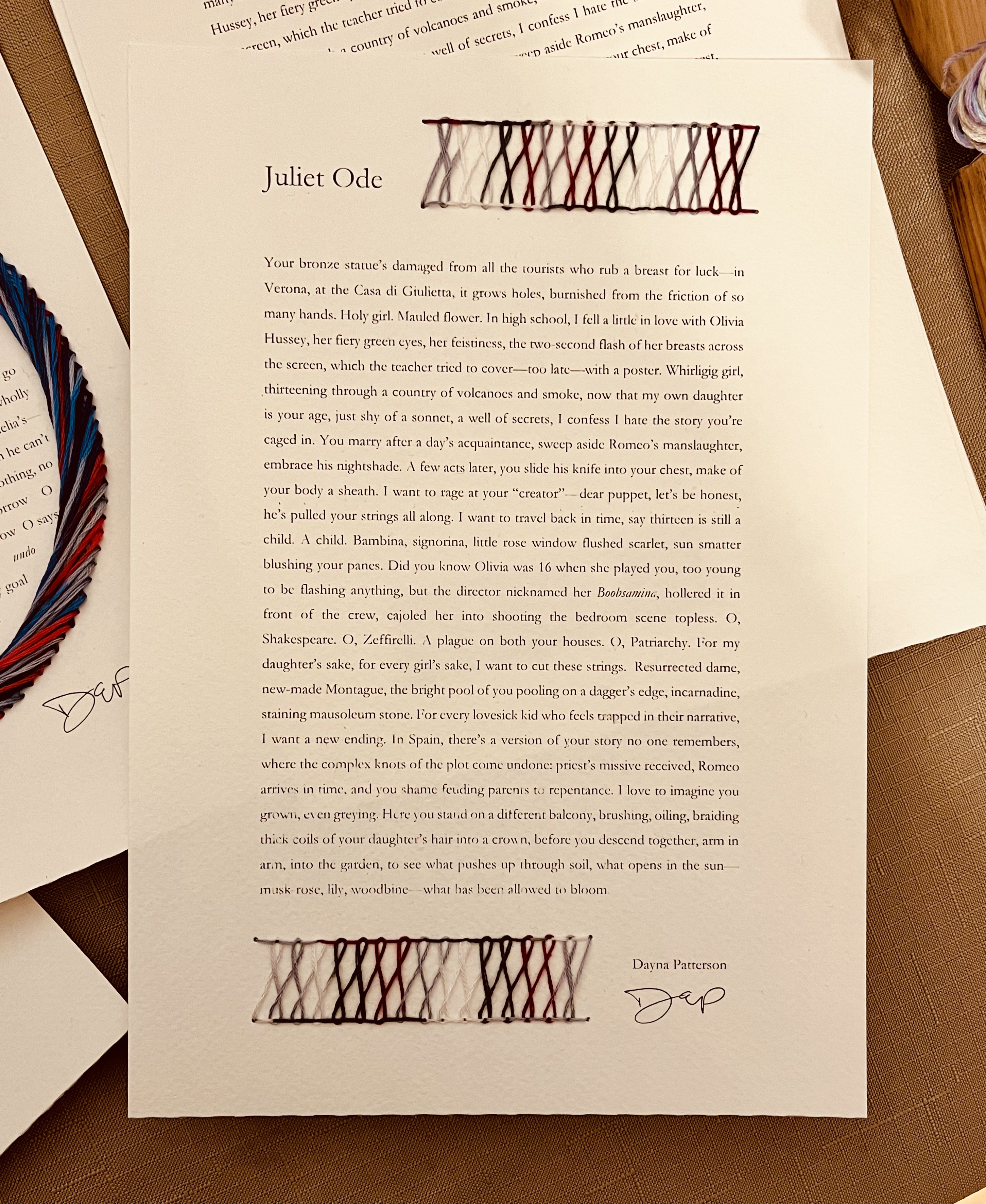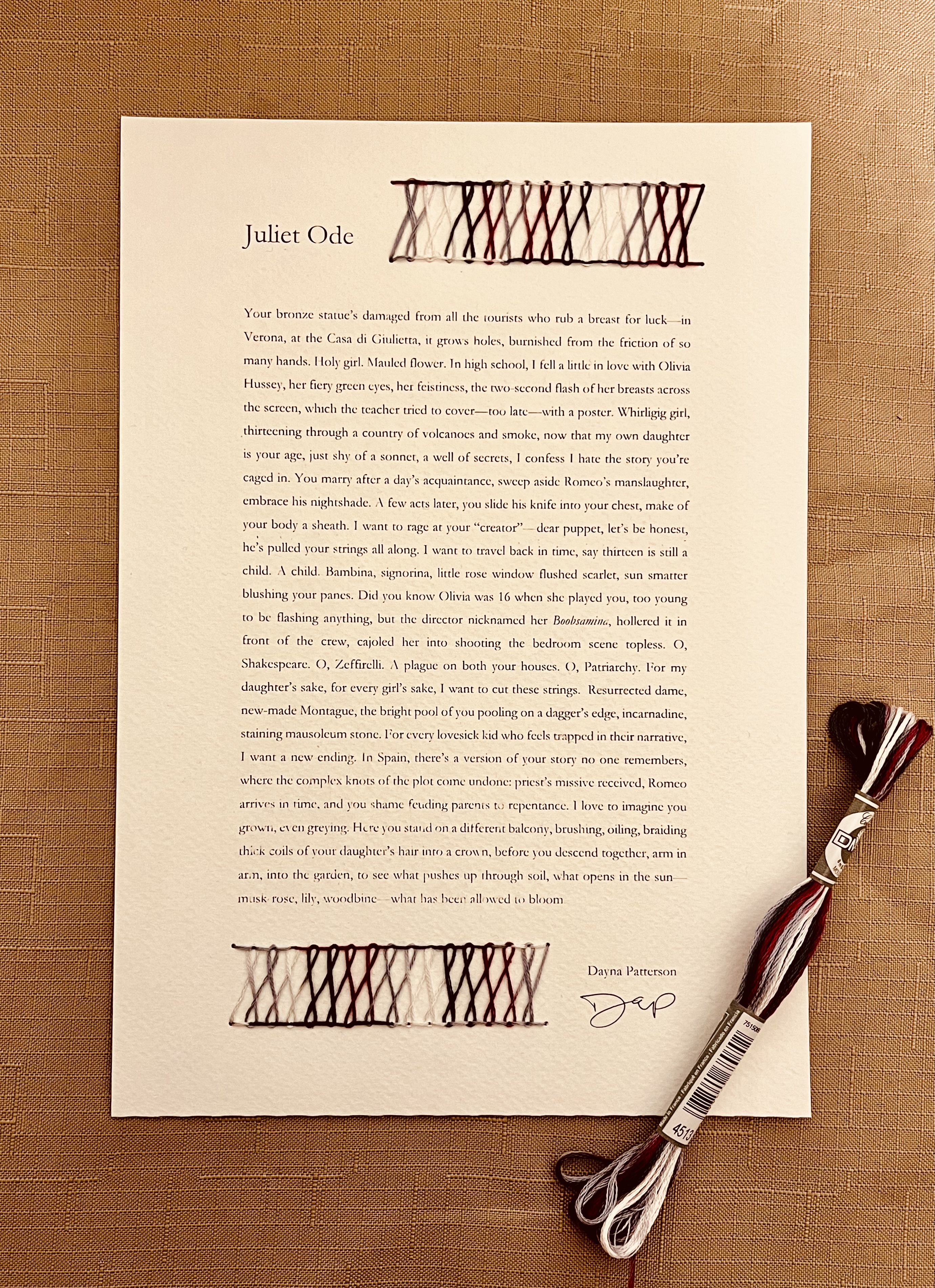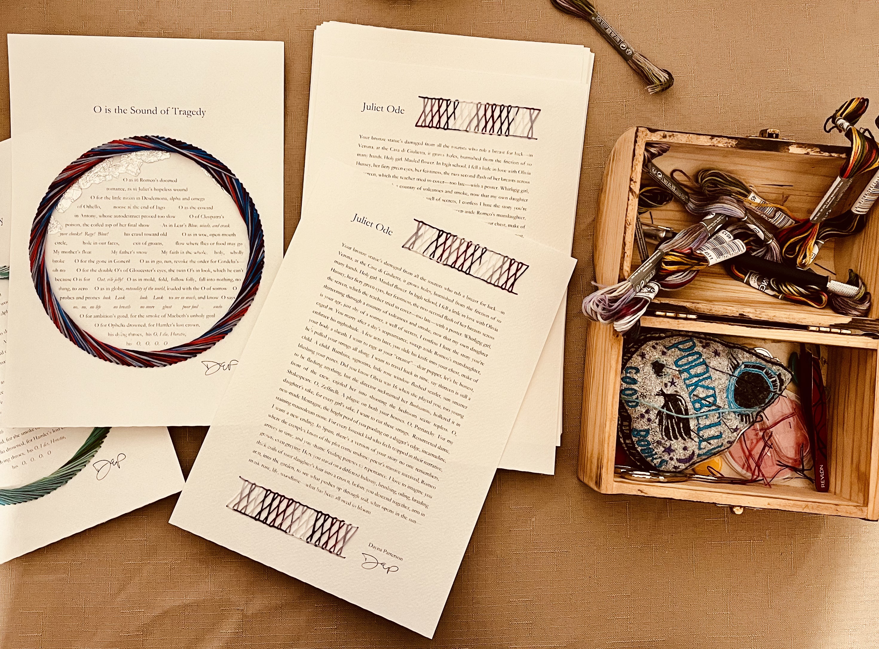 “Juliet Ode” broadside, signed and embroidered in various colors. 7 x 10 in.